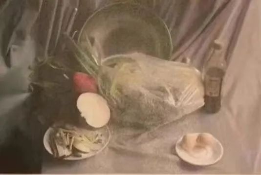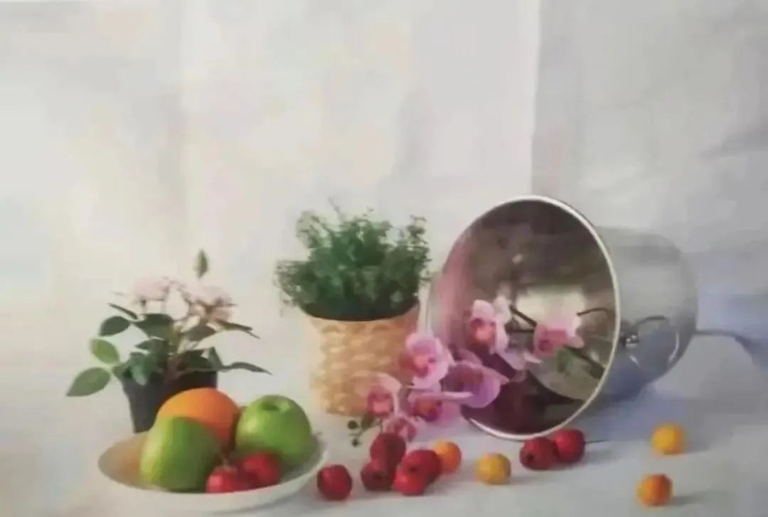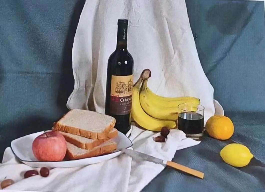 默写:一个白色石膏球,一个红色框的眼镜,一个玻璃杯里插着一支黄花,两本书,两个红苹果,一块白布,一块蓝布
