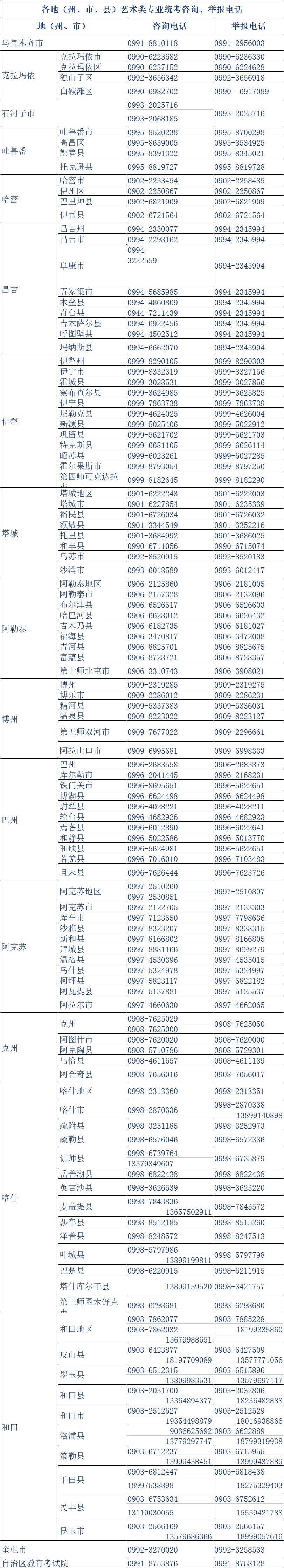 请考生密切关注“新疆招生”(xjzs140304)微信公众号和“新疆招生网”(www.xjzk.gov.cn)发布的有关艺术类专业统考最新信息。考生如有疑问,可拨打当地教育考试机构咨询电话(详见下表)咨询相关事宜。