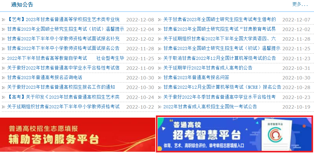2.点击“通知公告”栏目下方的“普通高校招考智慧平台”。