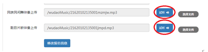10.报名舞蹈类统考的考生,请于报名页面下方上传考试时所使用的伴奏曲目,上传完毕后务必点击“试听”按钮进行试听,确保上传曲目可播放及其完整性。
