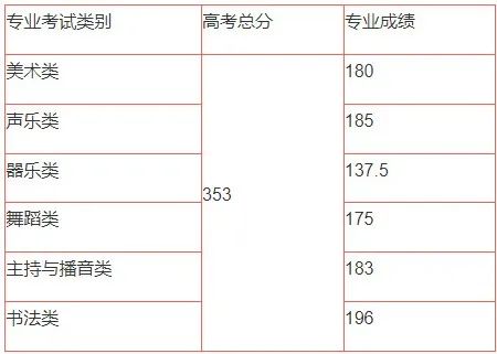 美术、音乐、播音、表演、编导、舞蹈、书法、摄影摄像:各专业统考合格线均为155分
