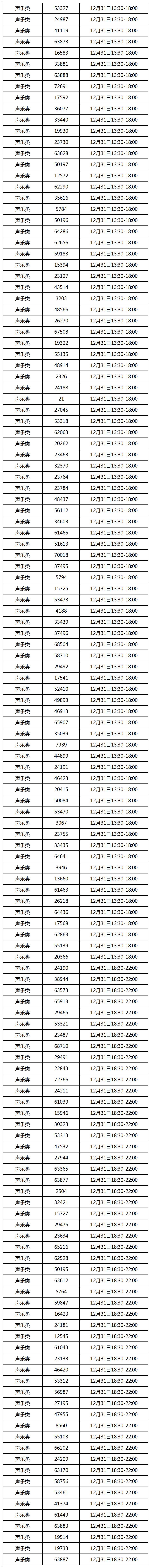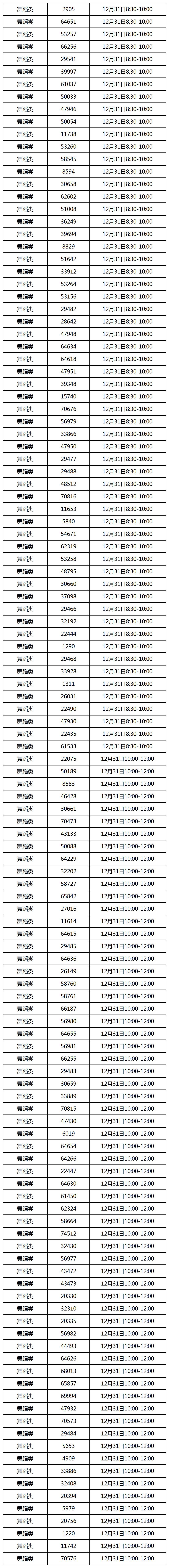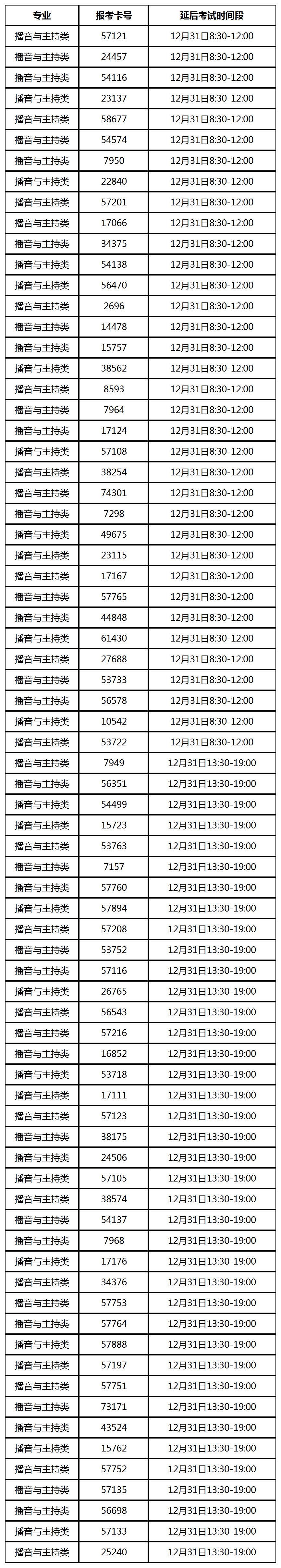四、声乐(演唱、视唱)、舞蹈、播音与主持专业延后考生报考卡号和考试时间段安排见下表。