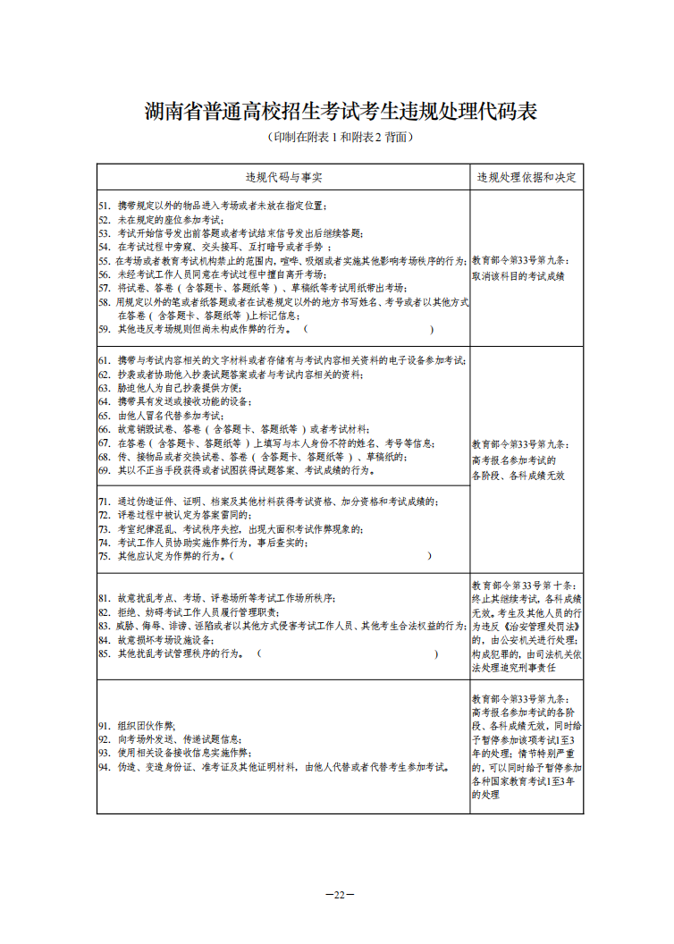 湖南省普通高校招生考试考生违规