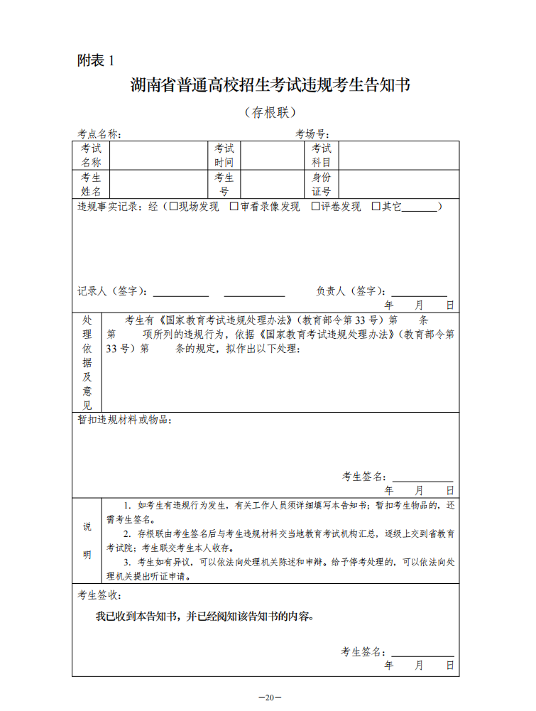 1.湖南省普通高校招生考试违规考生告知书(存根联)