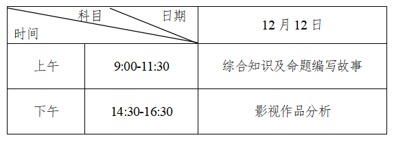 考试时间统一为2021年12月12日,考生须在考试前3天开始登录“报名缴费指定系统”打印《专业考试证》,11日下午17时-18时期间前往考试地点熟悉笔试考场,但不能进入考室。“综合知识及命题编写故事”科目开考15分钟(12日上午9∶15)后,考生不得进入考室;“影视作品分析”科目开考前15分钟(12日下午14∶15)后,考生不得进入考室。考生必须凭第二代居民身份证以及《专业考试证》在规定的时间和地点参加专业考试。其中笔试时间统一安排如下:
