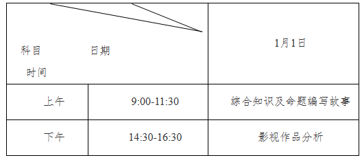考试时间统一为2021年1月1日,考生须在考试前3天开始登录“报名缴费指定系统”打印《专业考试证》,12月31日下午17点前往考试地点熟悉笔试考场。“综合知识及命题编写故事”科目开考15分钟(1日上午9∶15)后,考生不得进入考室;“影视作品分析”科目开考前15分钟(1日下午14∶15)后,考生不得进入考室。考生必须凭第二代居民身份证以及《专业考试证》在规定的时间和地点参加专业考试。其中笔试时间统一安排如下: