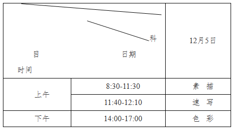 书法艺术和书法教育类考试全省考生随机编排在长沙市内若干考点,具体考试地点安排见《专业考试证》。考生须在考试前3天开始登录“报名缴费指定系统”打印《专业考试证》,12月5日下午17点前往考试地点熟悉笔试考场。考生必须凭第二代居民身份证以及《专业考试证》在规定的时间和地点参加专业考试。考试时间具体安排如下:
