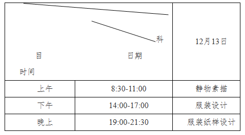 考试所需绘画工具、剪裁工具等自备。服装工艺考试具体时间、地点详细安排由考点另行公布,静物素描、服装设计、服装纸样设计考试时间统一安排如下: