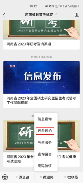 点击“河南省教育考试院”微信公众号菜单,选择【微服务】->【艺考预约】,进入艺考预约的小程序,进行预约操作。