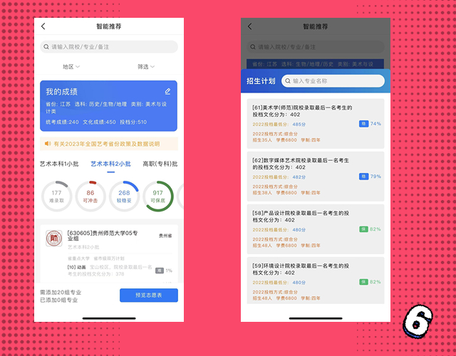 整合艺考政策,结合考生分数,通过系统测算,大数据匹配等多种自有核心算法,为学生智能推荐志愿填报方向,生成冲、稳、保多梯度选择。