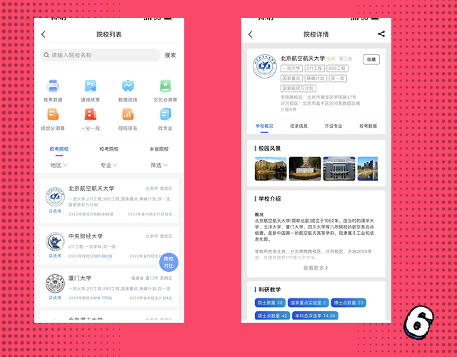 院校数据一目了然。展示全国、本省、北上广高校列表及高校排名。可搜索名称筛选显示院校类型、院校标签、学科层次、地理位置等信息。