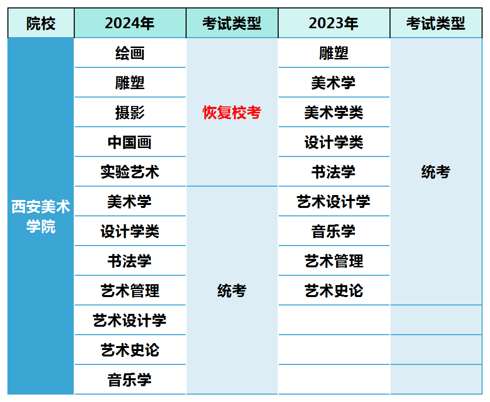 西安美术学院2022年和2023年所有专业采用各省统考成绩,2024年恢复5个专业校考,其他专业仍采用统考成绩,详情如图: