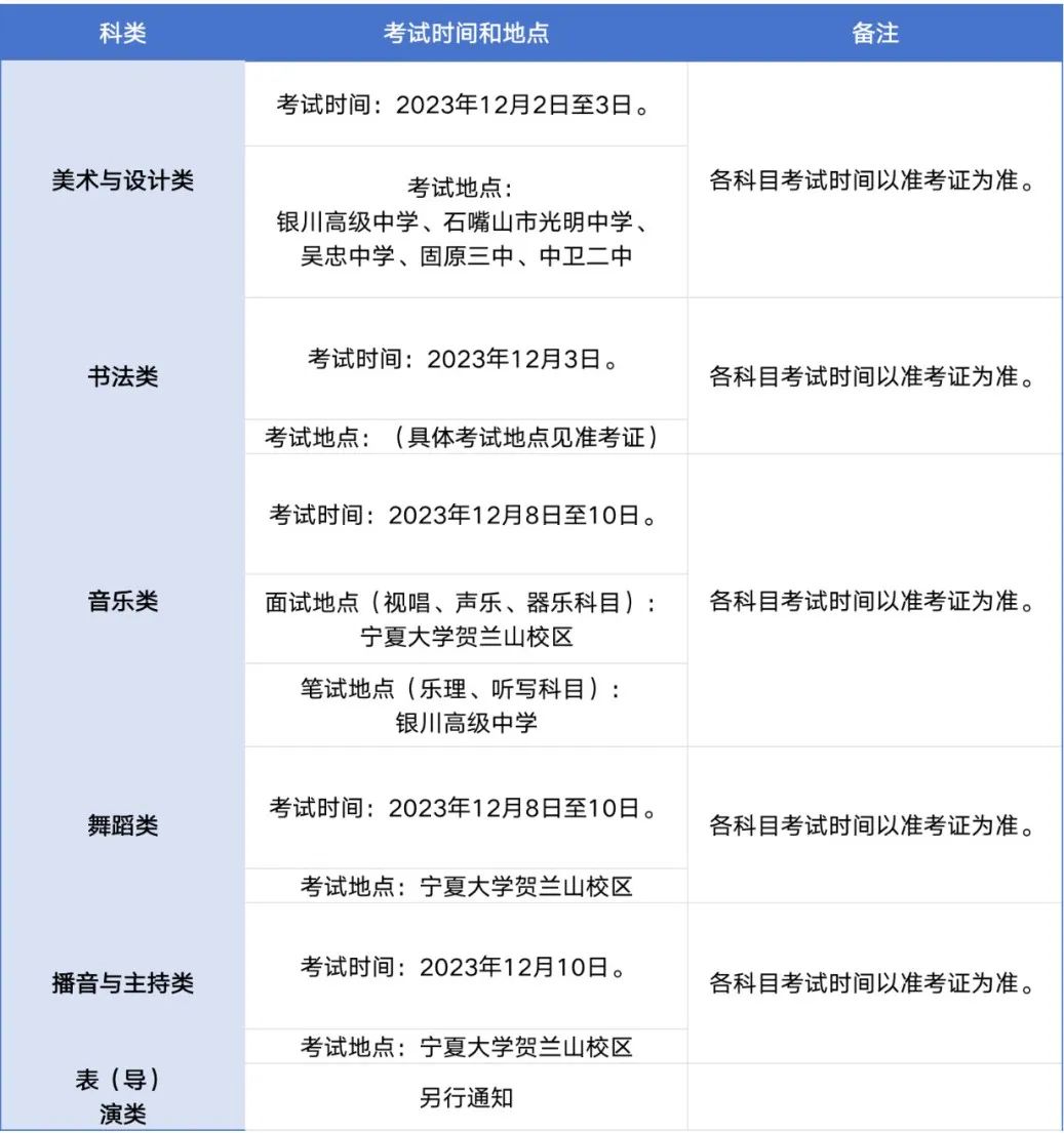 全区采取统一命题、统一考试、统一评卷的形式,各科类省级统考的科目、分值、考试内容、考试要求、考查范围以《自治区招生工作委员会办公室关于印发〈宁夏回族自治区进一步加强和改进普通高等学校艺术类专业考试招生工作实施方案(试行)〉的通知》(宁招委办〔2023〕4号)中的附件1(《宁夏回族自治区普通高等学校艺术类专业省级统一考试说明(试行)》)为准。
