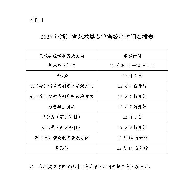 美术与设计类省统考考生在高考报名地所属的设区市参加专业考试。音乐、舞蹈、表(导)演、播音与主持、书法等5类省统考,专业考试在指定考点集中进行。各科类省统考时间安排见附件1,报考简章详见浙江省教育考试院网站(www.zjzs.net)。