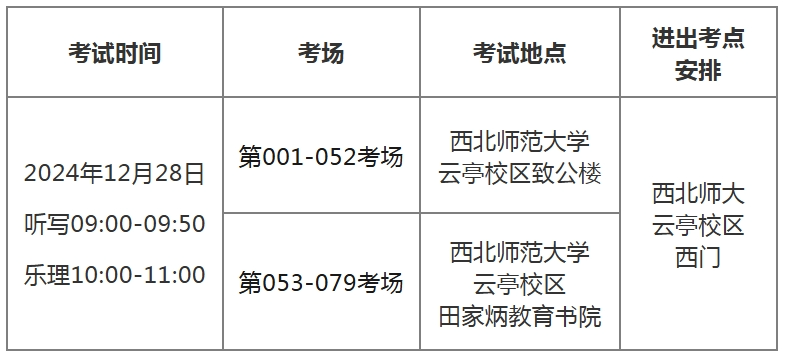 1.考生在参加听写、乐理科目笔试时应在西北师范大学云亭校区西门排队进入学校,根据路标指引到相应考点门前排队,由考点工作人员进行入场核验。开考45分钟前,考生开始入场;开考15分钟后,迟到考生不得入场(考试封闭区域);考试全程,考生不得离开考场。