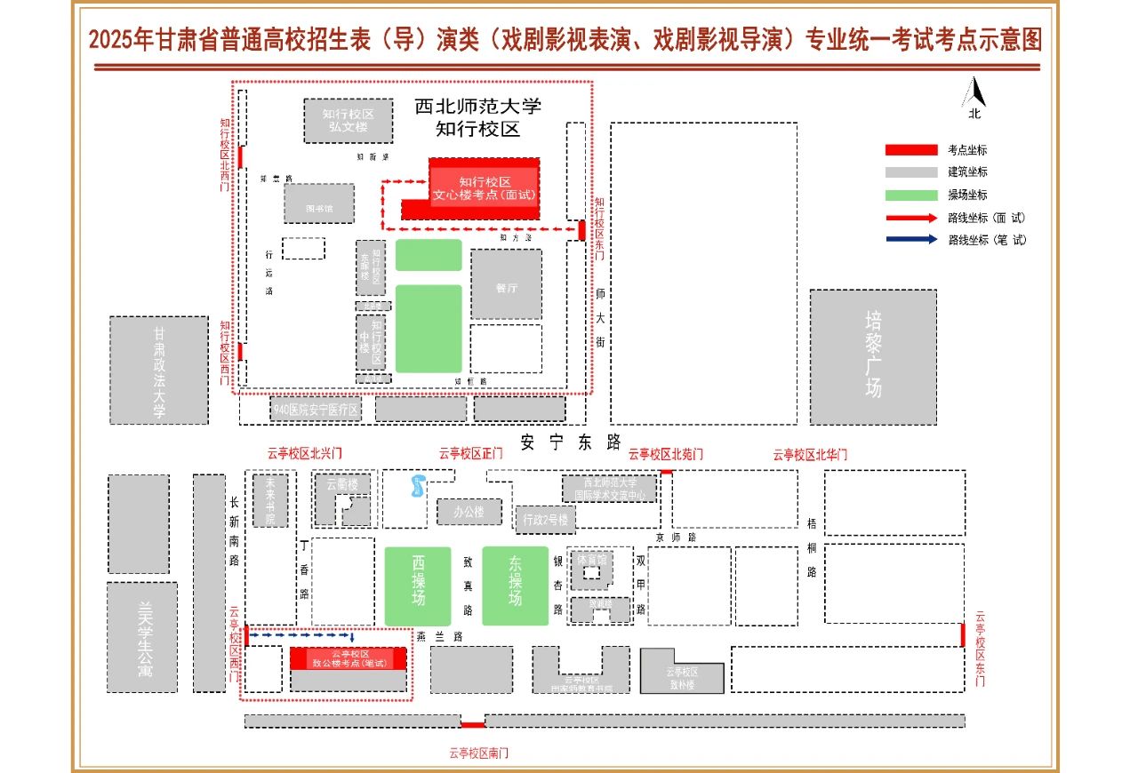 笔试考点设在西北师范大学云亭校区(地址:兰州市安宁区安宁东路967号);面试考点设在西北师范大学知行校区(地址:兰州市安宁区邱家湾37号)。