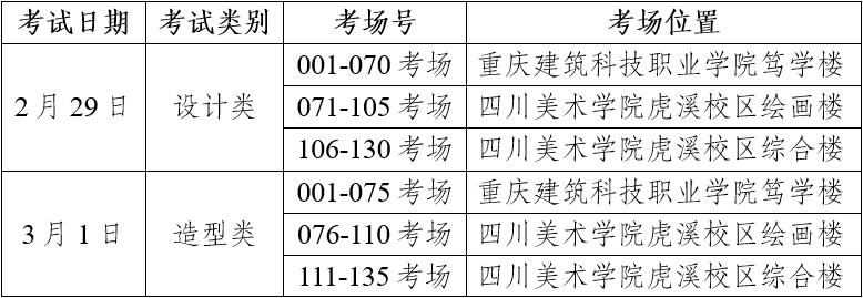 四川美术学院2024年本科招生现场复试设四川美术学院虎溪校区(重庆市沙坪坝区大学城南路56号)、重庆建筑科技职业学院(重庆市沙坪坝区明德路3号)两个考点,请考生打印准考证后,查阅考点、考场等具体信息,提前做好考试准备。