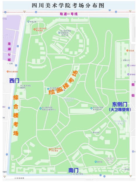 考前1小时开始进入考点,考生在四川美术学院虎溪校区东侧门、南门、西门依次排队进入,其它校门不对外开放。