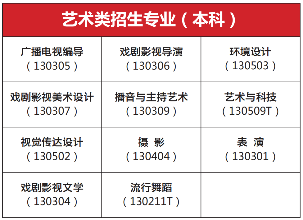 学校发挥综合性大学学科门类齐全的优势,将艺术教育与人文、科技有机融合,围绕广播电视、电影与网络媒体产业,开设广播电视编导、播音与主持艺术、戏剧影视文学、戏剧影视导演、戏剧影视美术设计、表演、摄影、视觉传达设计、环境设计、艺术与科技、流行舞蹈等11个艺术类本科专业。多年来,学校先进的教学理念、一流的教学环境和浓厚的学习氛围,为国家培养了大量的影视产品创意制作、网络媒体内容生产及环境艺术设计等领域的艺术人才。