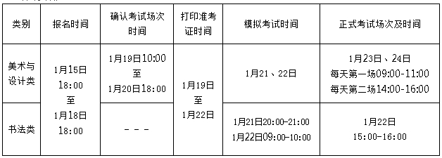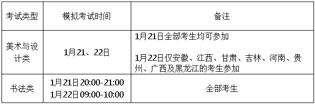 2024年1月19日-20日每天两场9:00- 11:00, 14:00-16:00, 共4场在线测试, 美术与设计类和书法类均可参加。个别考生因时间冲突无法参加模拟考试,则必须参加在线测试熟悉考试流程。
