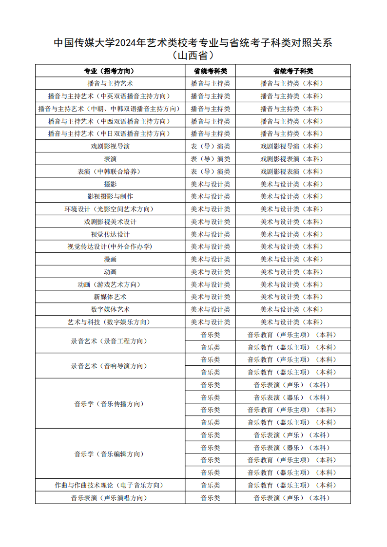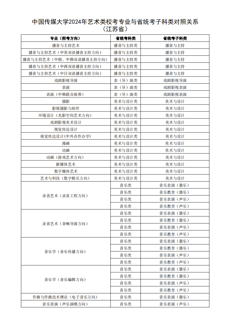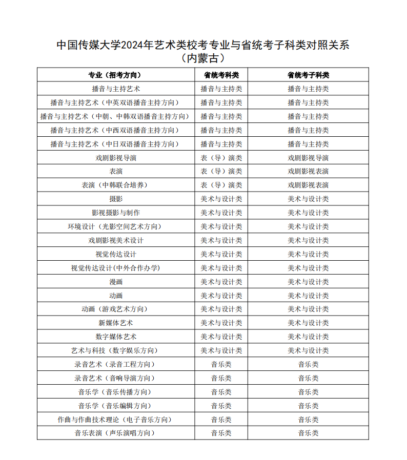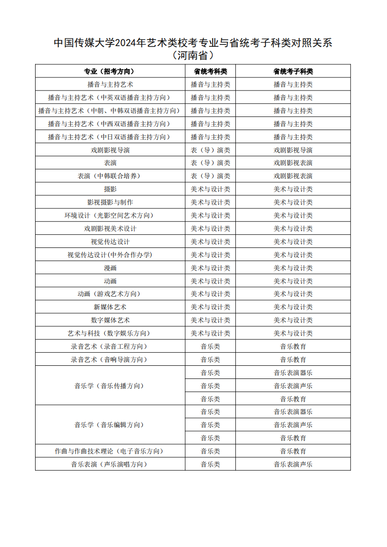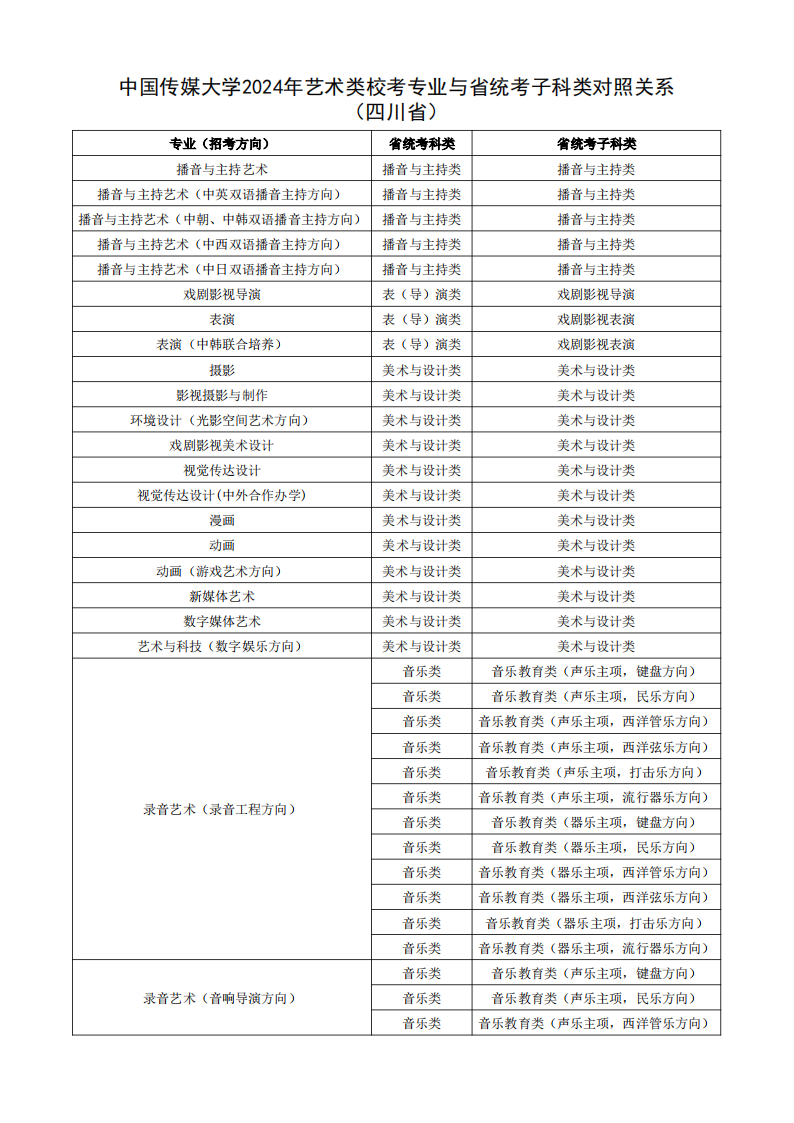 根据教育部相关文件规定,经各省级招生考试机构审核通过,现发布我校2024年艺术类校考专业与省统考子科类对照关系。
