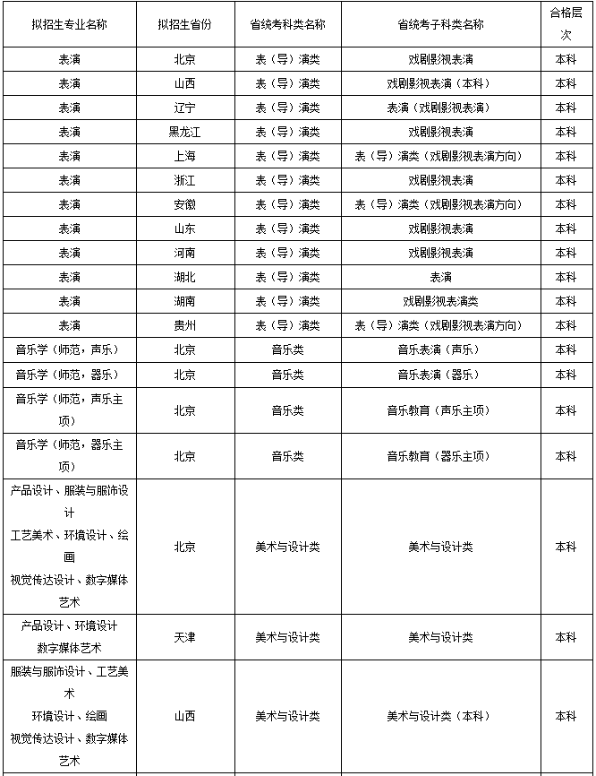 说明:此参照表涉及的各拟招专业与各省级艺术类统考子科类的对应关系,已由学校上报且经各省级招生考试机构审核通过,请考生遵照执行。最终招生专业按照招生当年各省级招生考试机构发布的为准。