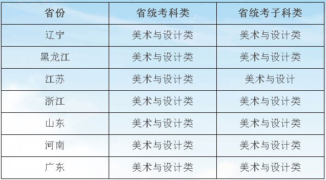 沈阳化工大学2024年拟招生艺术类专业为设计学类(1305),拟招生省份为辽宁、黑龙江、江苏、浙江、山东、河南和广东,具体各省省统考科类与省统考子科类如下表所示:
