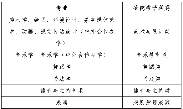 按照教育部有关文件要求,结合我校招生实际情况,经学校研究决定,自2024年起,我校艺术类专业不再组织专业校考,专业课成绩统一使用生源省(区、市)招生考试机构组织的对应艺术类专业省统考成绩。专业与省统考子科类对照情况如下: