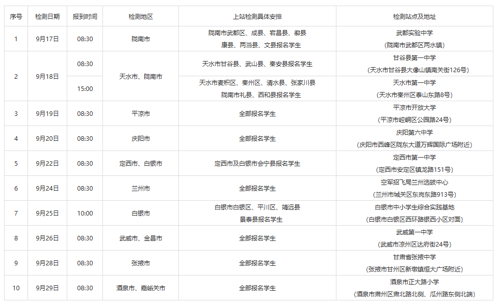 注意事项:1.学生饭后参检,无需空腹;参检前请注意个人卫生;2.前期错过报名且符合基本条件的学生可直接到就近检测站点报名参检;3.参检学生请严格按照日程安排上站参检,提前10-15分钟报到候检;检测计划如有调整,以我中心通知为准,联系电话:0931-4865353、8958030。