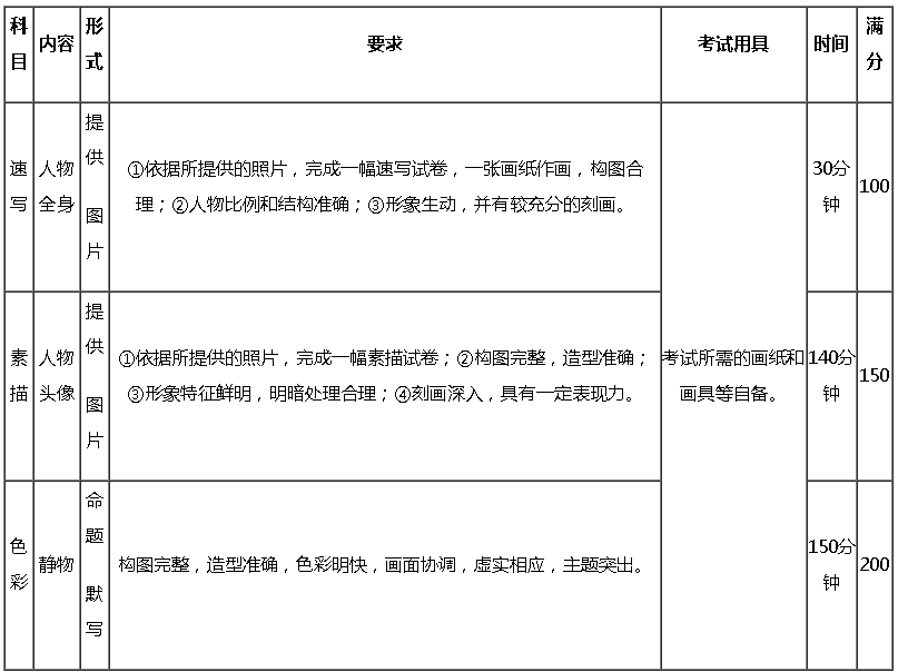 取消原定的广州、长沙、苏州三个考点线下考试,考试形式由初选、线下考试,调整为线上考试,其中素描、速写科目的形式由模特写生调整为提供图片。具体考试科目及要求如下: