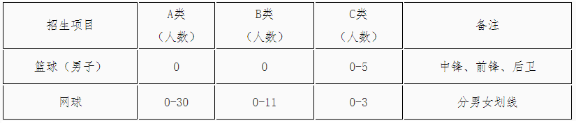 C类:对极少数体育项目成绩特别突出并且是学校急需项目的国家一级(含)以上运动员(必须有相应运动等级证书),须参加面向此类人员的单独招生文化课考试,合格者可免于参加普通高考。这类考生入选公示人数不超过学校今年高水平运动队招生计划的20%(8人)。