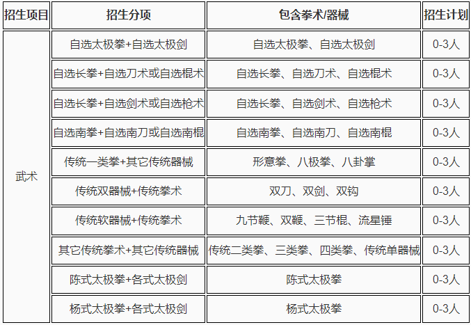 我校高水平运动队招生将按照优中选优,宁缺毋滥的原则选拔。乒乓球项目拟招生计划为0-20人,其中男子项目和女子项目拟招生计划各为0-10人;武术项目各招生分项拟招生计划如下;各项目及招生分项实际招生人数可视生源情况进行适当调整。