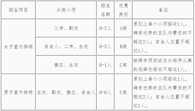 3.C类:申请录取优惠条件为二本线且体育专项测试成绩优秀,按照专项测试成绩和运动队发展需要进行认定,并依据测试成绩和填报志愿,按高水平运动队招生专业计划认定专业。