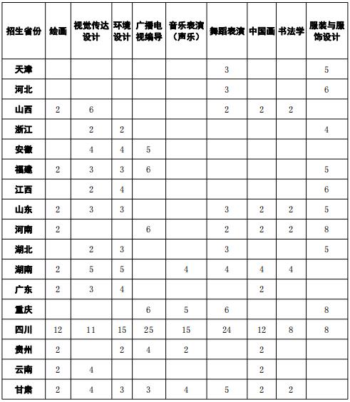 四川大学2022招生专业有:绘画、环境设计、广播电视编导、音乐表演(声乐)、舞蹈表演、中国画、书法学、服装与服饰设计。