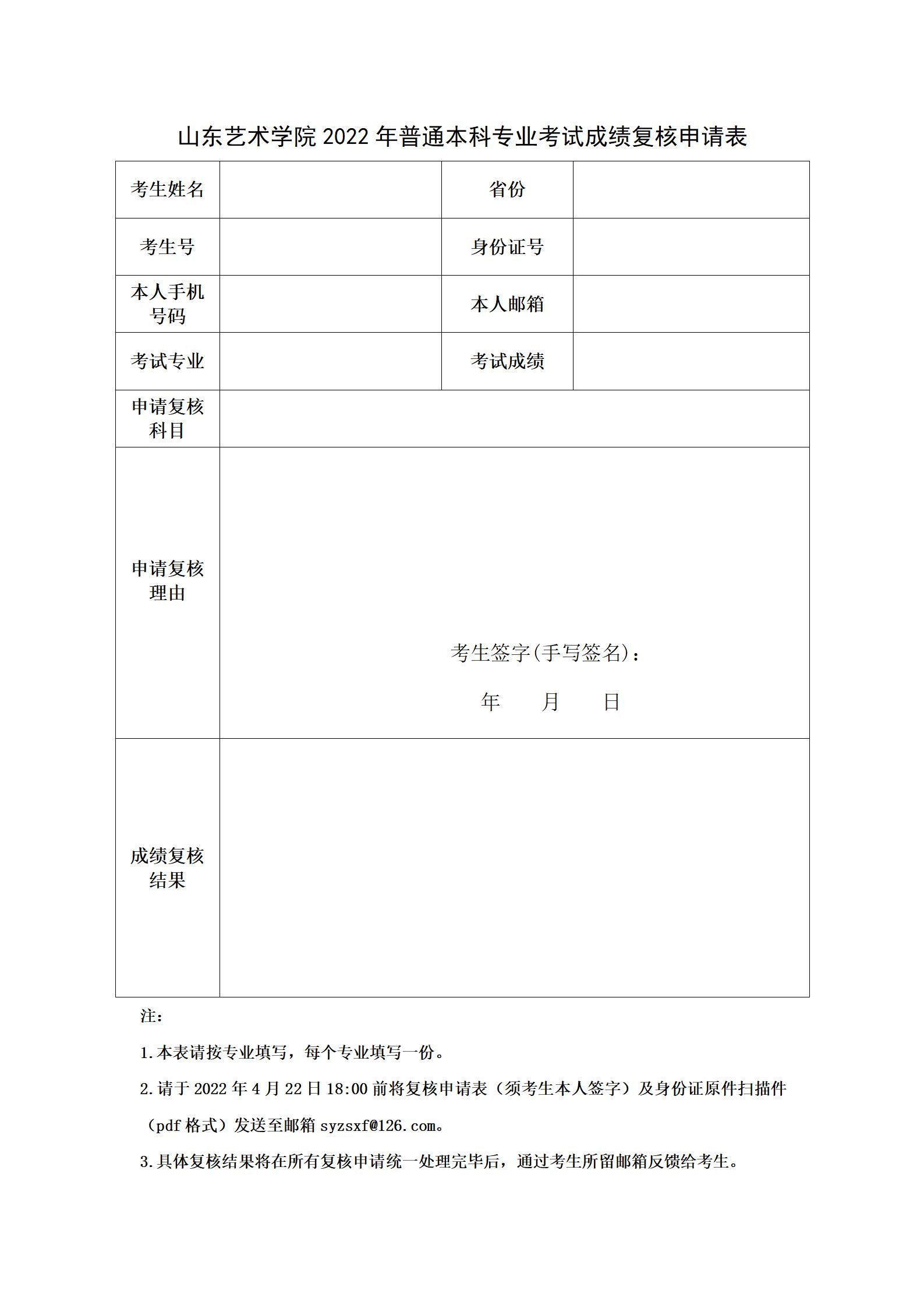 考生如对本人专业成绩有异议,请填写《山东艺术学院2022年普通本科专业考试成绩复核申请表》,于2022年4月22日18:00前将申请表(考生本人亲笔签名)及身份证原件扫描件(pdf格式)打包发送至邮箱syzsxf@126.com。请复核成绩的考生在规定时间内,按要求提交复核申请材料,逾期不再受理。
