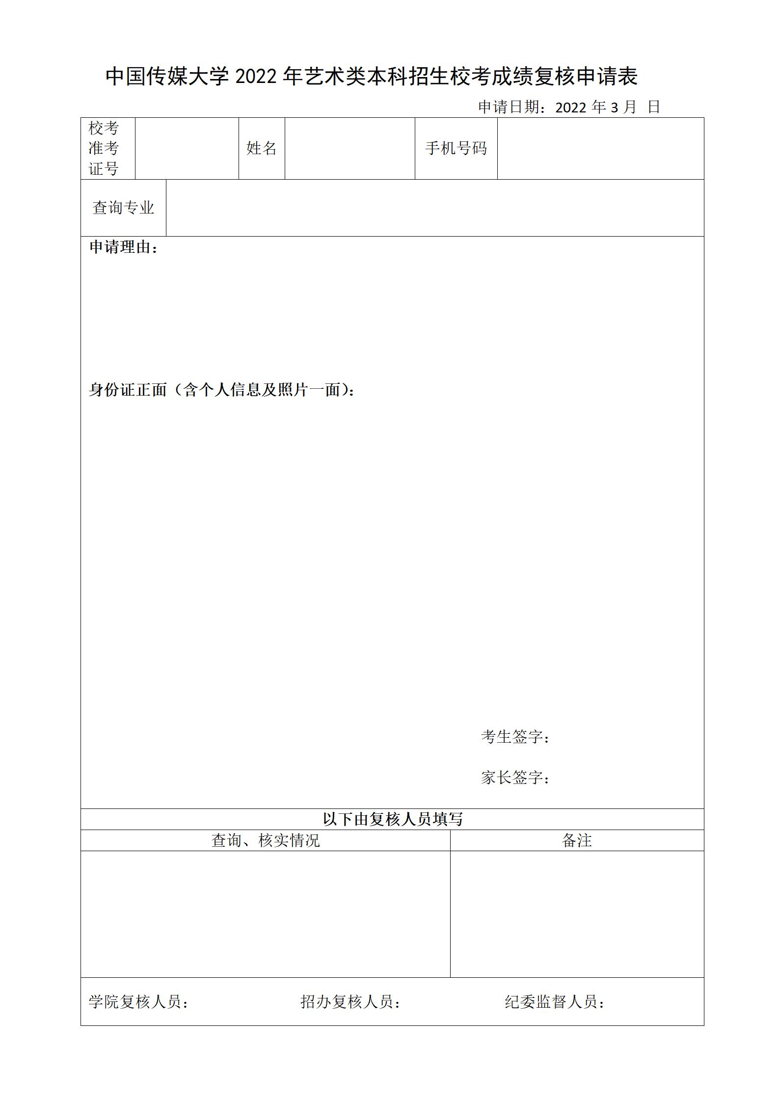 3、 在指定时间内下载并填写《中国传媒大学2022年艺术类本科招生校考成绩复核申请表》,扫描或拍照(务必保证清晰)后发送至cuczsb@cuc.edu.cn。