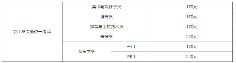 高考大报名和艺术类市统考网上报名成功的考生,须于2021年11月8日—10日期间规定时间内,通过“上海招考热线”报名系统支付所选择的艺术类统考项目相应的考试费用(每项艺术类专业统考报名费20元/人,每项艺术类专业统考的每科目考试费50元/科)。各类收费标准如下: