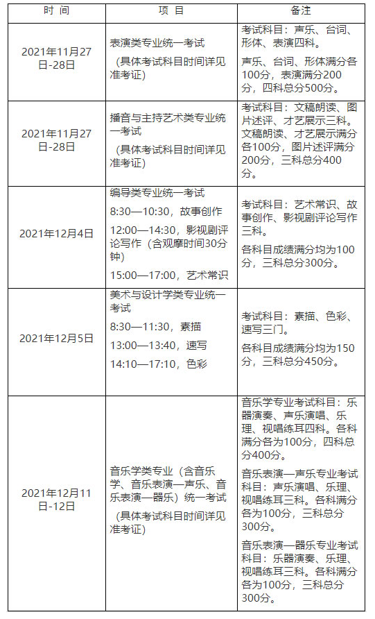 本市艺术类市统考包括美术与设计学类、编导类、表演类、播音与主持艺术类、音乐学类(音乐学)、音乐学类(音乐表演—声乐)和音乐学类(音乐表演—器乐)七个类别的考试。具体安排如下: