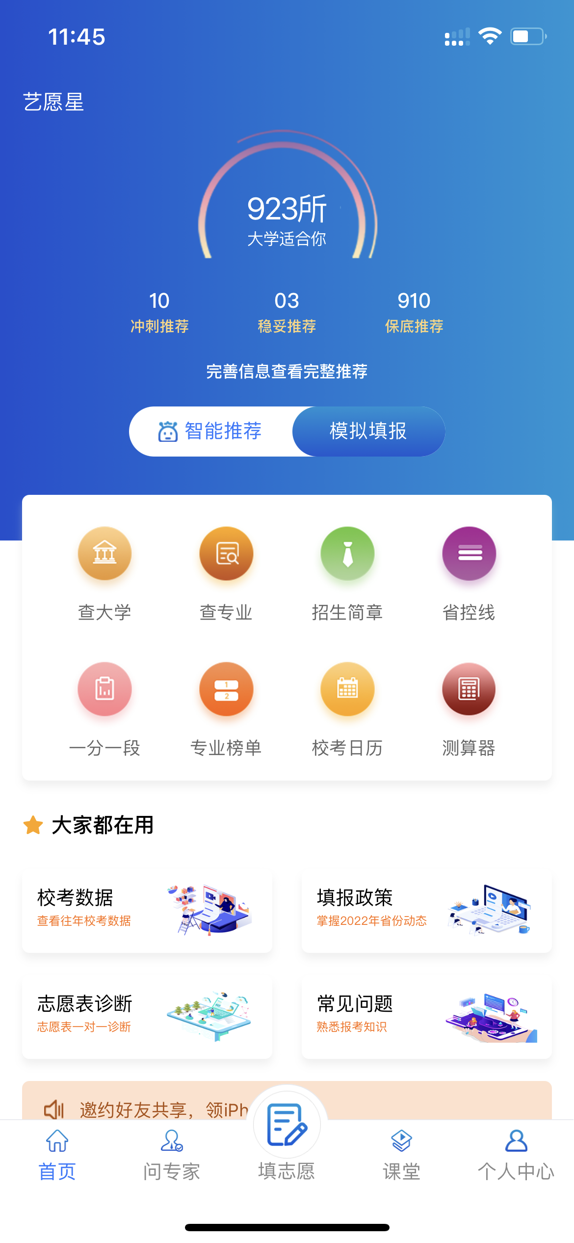 艺愿星涵盖艺术类资讯、往年高校专业计划、历年分数线等数据,辅助艺术类高考生进行志愿填报!