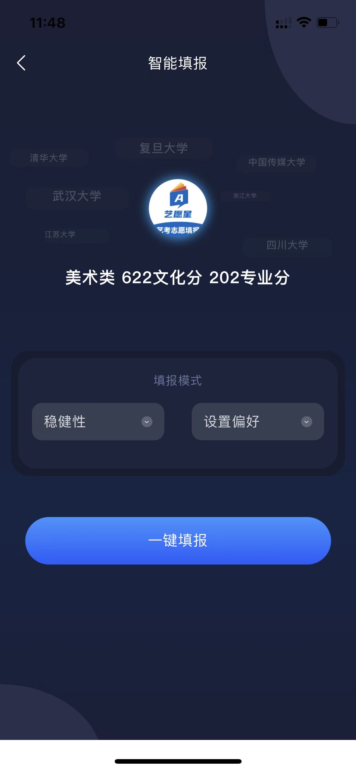 ·整合了艺考政策,结合考生分数,通过系统测算,大数据匹配等多种算法,为学生智能推荐志愿填报方向,生成冲、稳、保等填报选择。