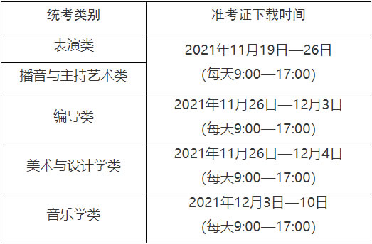 2022年上海市普通高校招生艺术类专业统一考试将于2021年11月底开始。艺术类专业统考准考证由考生本人自行网上下载。符合上海市高考报名资格、已在网上报名参加本市美术与设计学类、编导类、表演类、播音与主持艺术类、音乐学类专业统考并完成网上付费的考生登录上海市教育考试院“上海招考热线”网站(www.shmeea.edu.cn),点击页面下方的“考试报名”栏目进入,下载并打印本人艺术类专业统考准考证。各统考类别准考证下载时间安排如下: