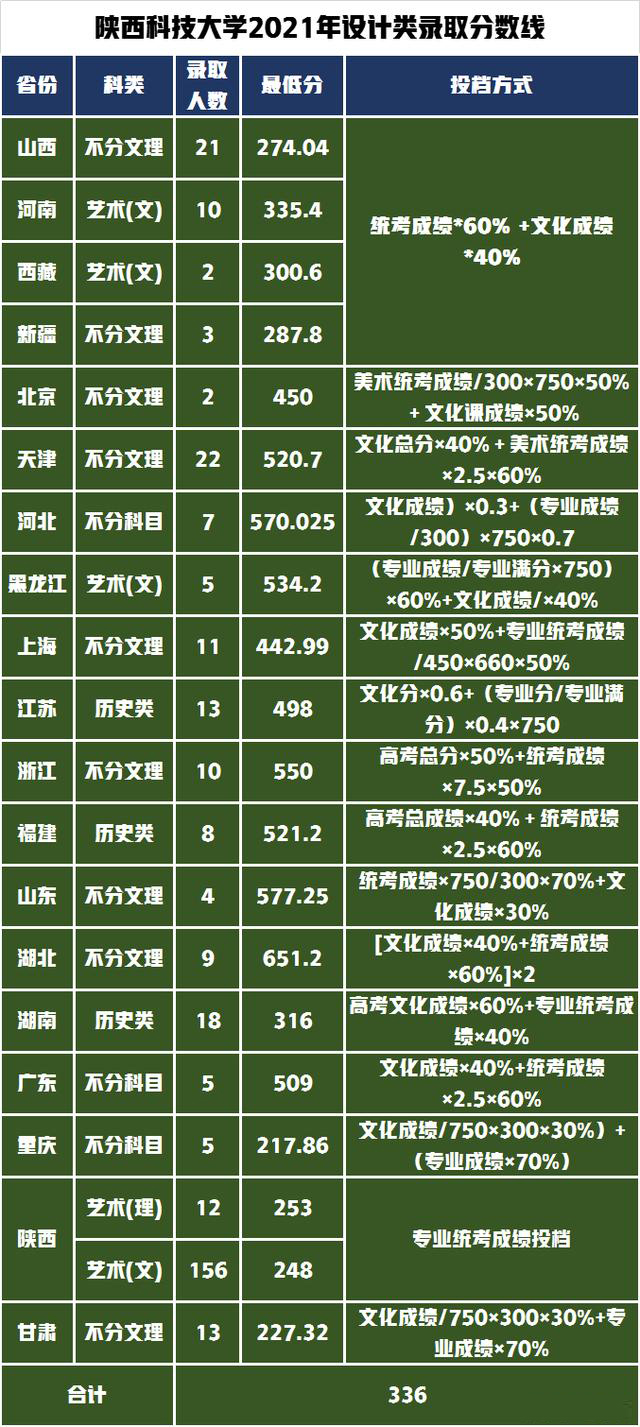 2022年美术设计类专业全部采取省级统考成绩录取,附陕西科技大学2021年设计类各省录取分数线及投档方式见下表: