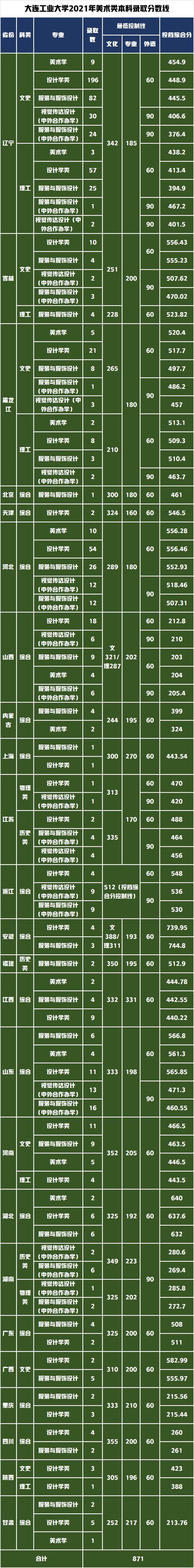 2022年大连工业大学采取统考成绩录取,录取原则按照各省投档成绩从高至低择优录取,附2021年各省录取专业及录取分数线见下表: