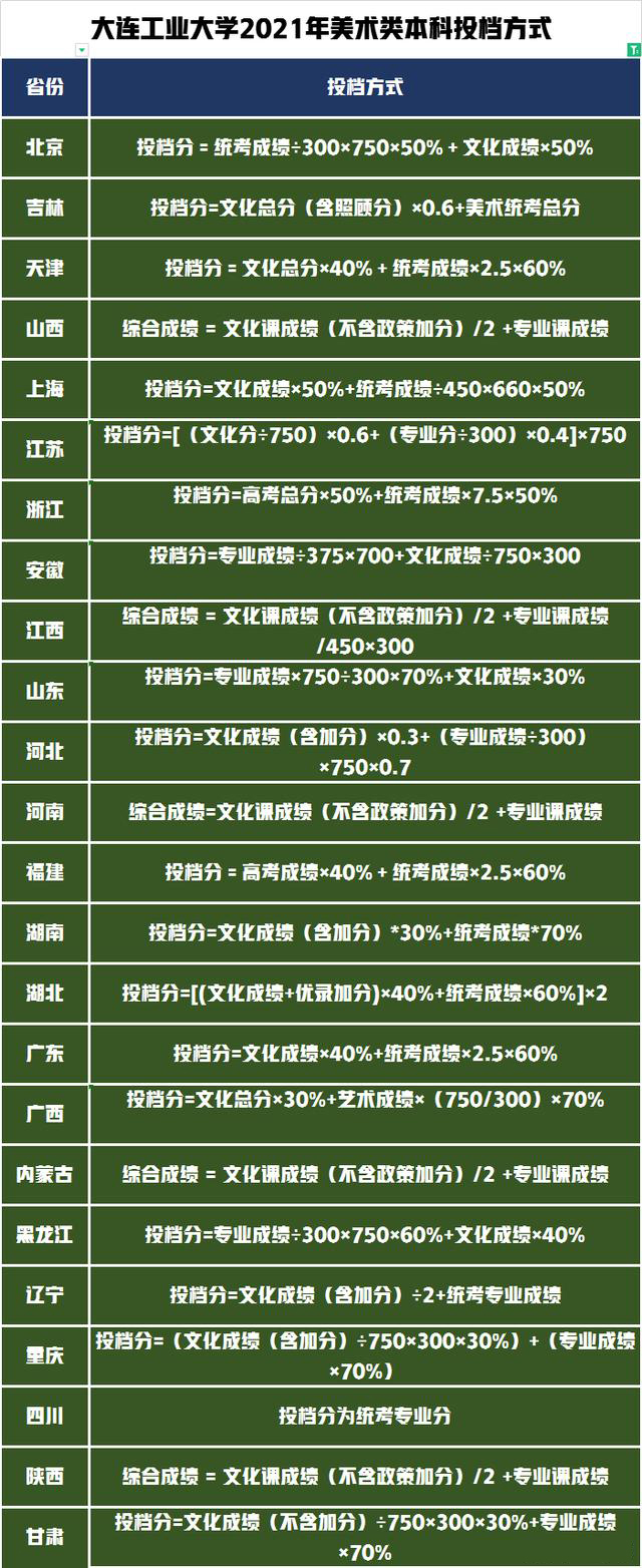 非平行志愿投档的省份,按非平行志愿综合分=美术统考成绩+高考文化成绩(文化成绩按满分750分折合)的综合成绩从高到低排序确定录取专业。