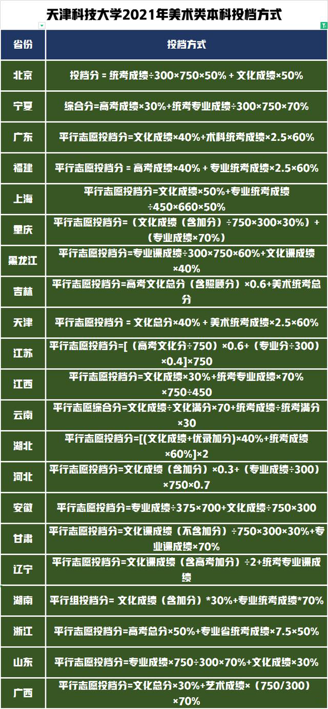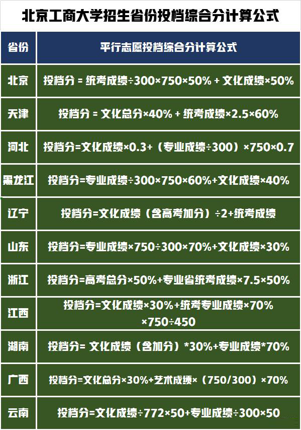 其余省份均按本省综合分成绩,计算综合分投档排名择优录取,具体综合分投档公式见下表: