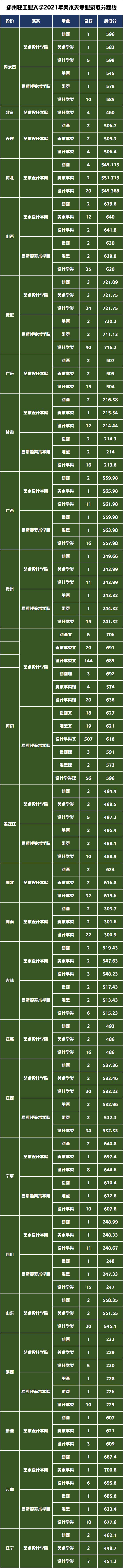 郑州轻工业大学2021年录取美术设计类艺考生1430人,录取专业、录取省份、录取人数及录取分数线见下表: