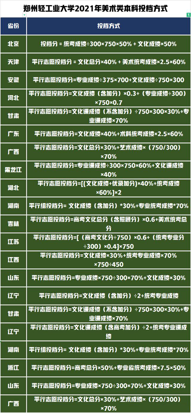 贵州、四川、陕西平行志愿按省统考专业成绩投档,从高至低按专业统考成绩排名录取,其余省份按本省综合分计算分投档,具体录取公式见下表: