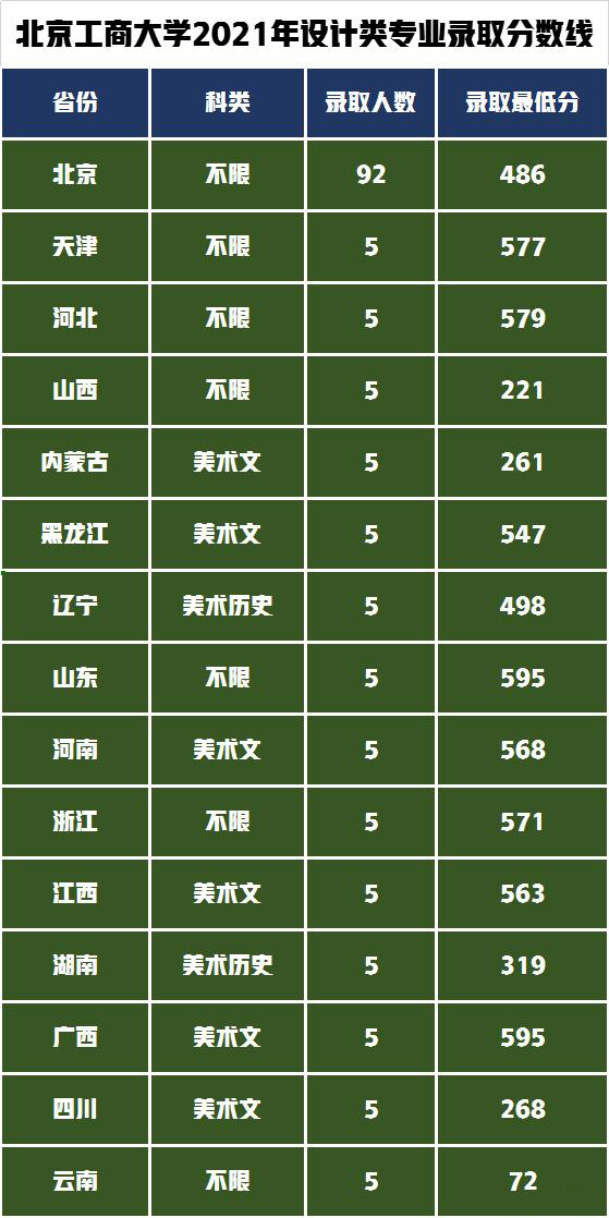 2022年采用各省美术统考成绩,招生计划暂未公布,2021年设计类专业按大类招生,招生省份2021年录取最低分数线见下表: