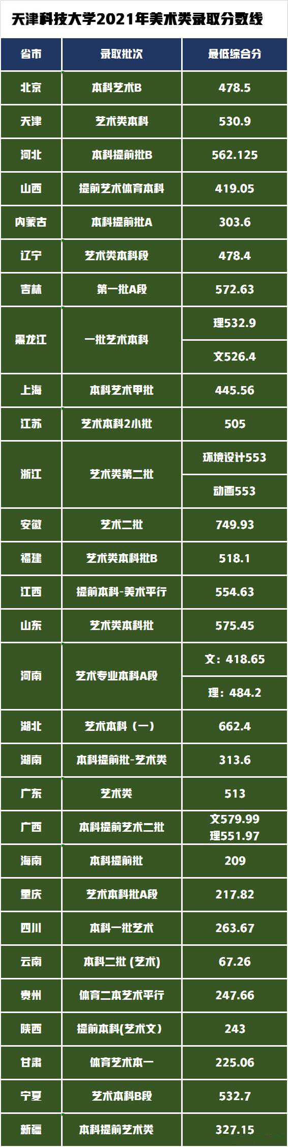 2022年采取各省美术统考成绩录取,附2021年各省美术与设计类专业录取批次及最低综合分录取成绩见下表: