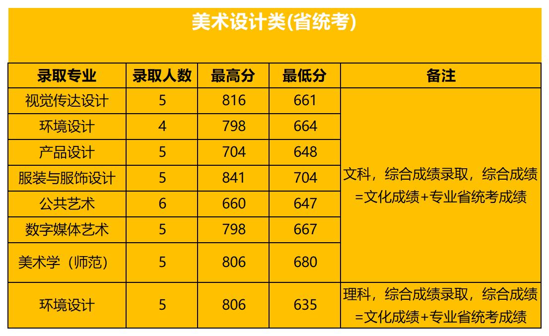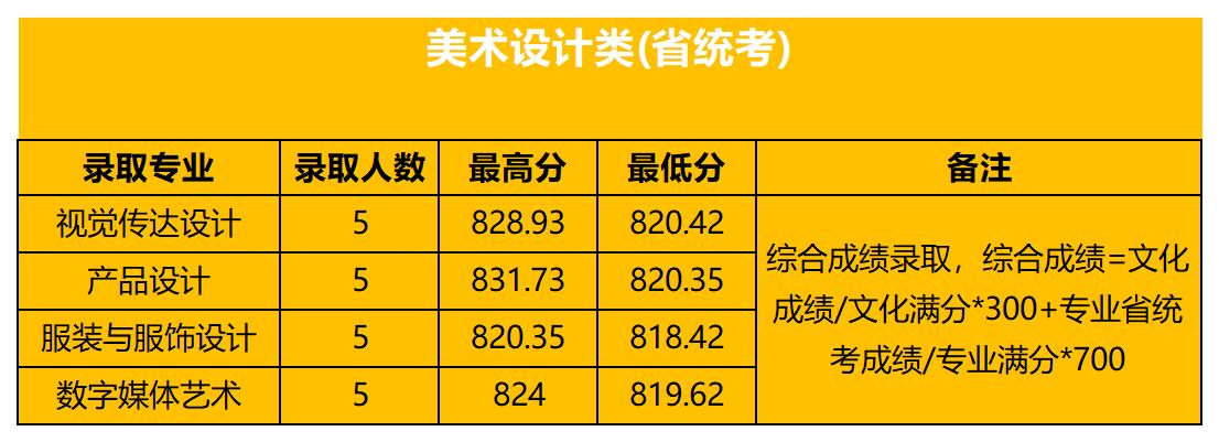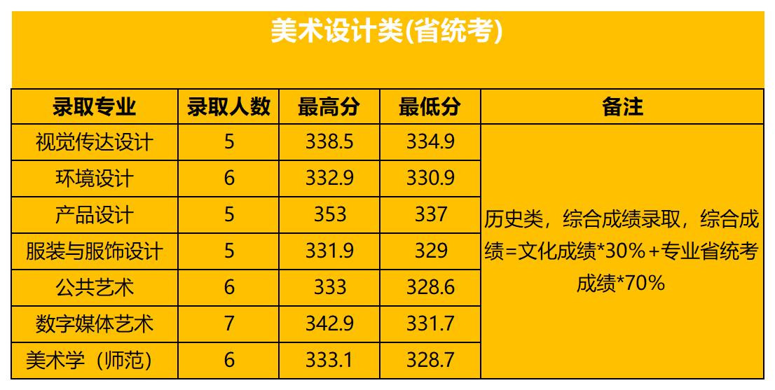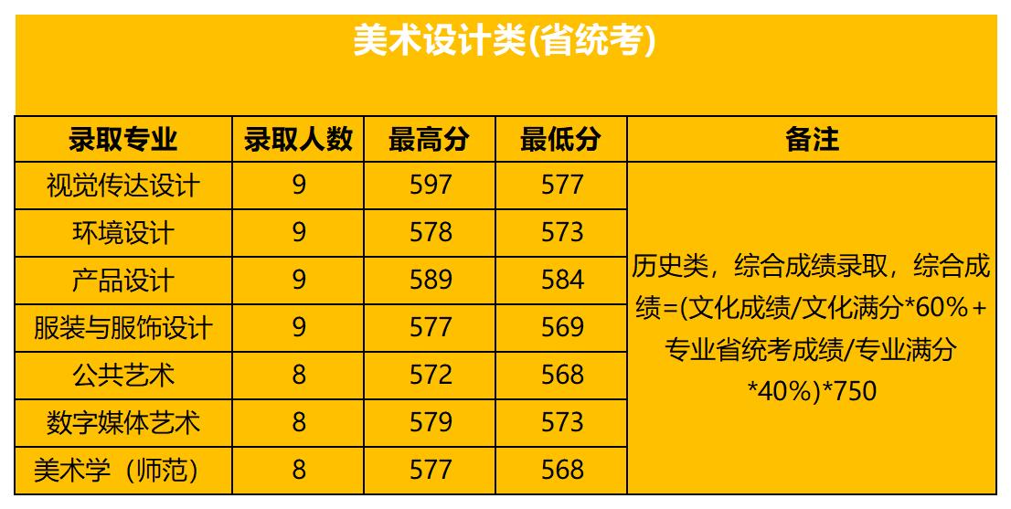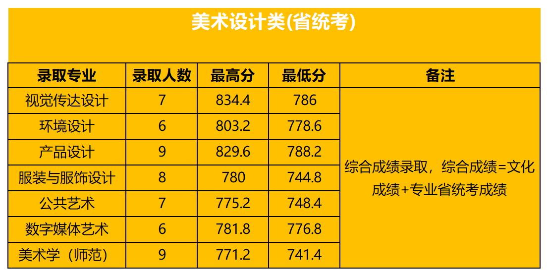 湖北省美术类专业采取统考成绩投档,按照本省投档公式计算综合进行投档,美术与设计类录取最低综合分710分,考生统考成绩240分需要高考文化成绩527分,2021年各专业录取分数线见下表: